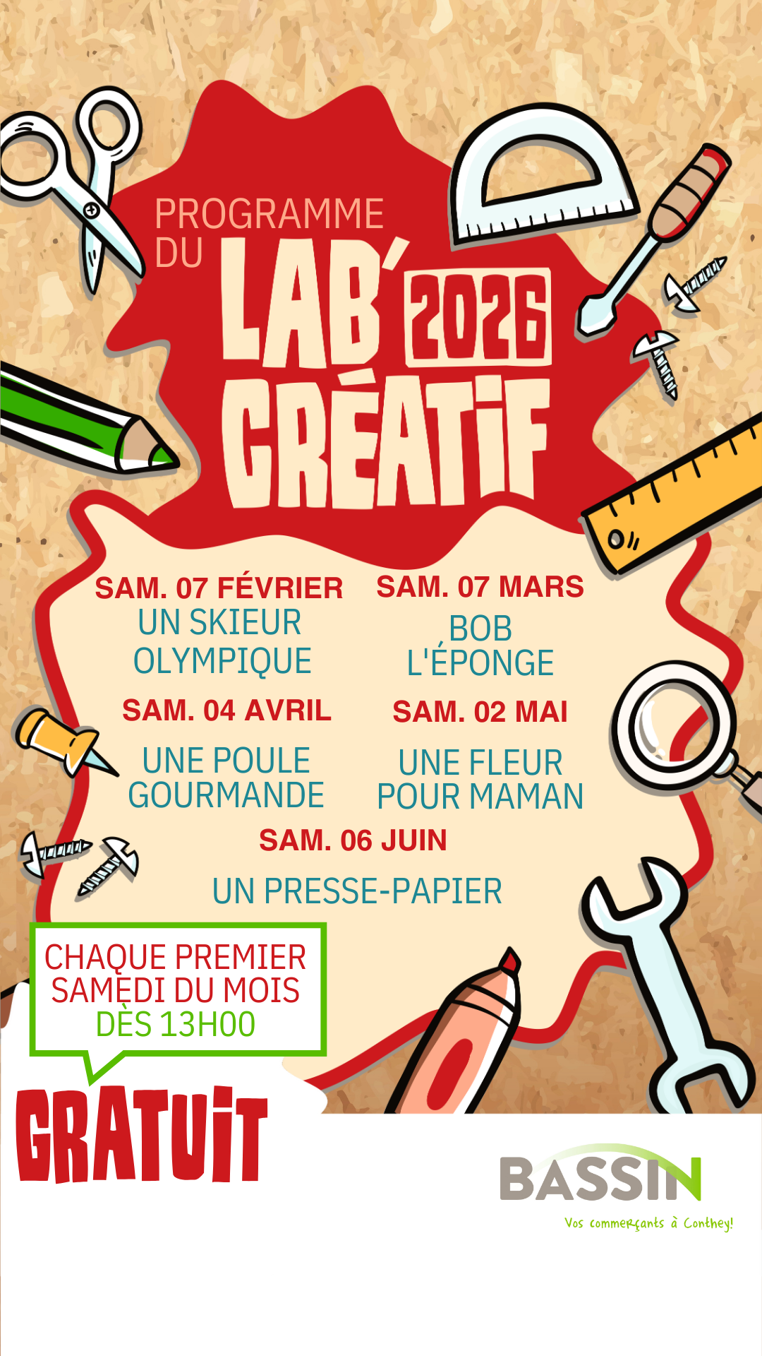 Les ateliers sont offerts par le Centre Bassin de Conthey, durant l’activité l’enfant reste sous la responsabilité d’un parent.